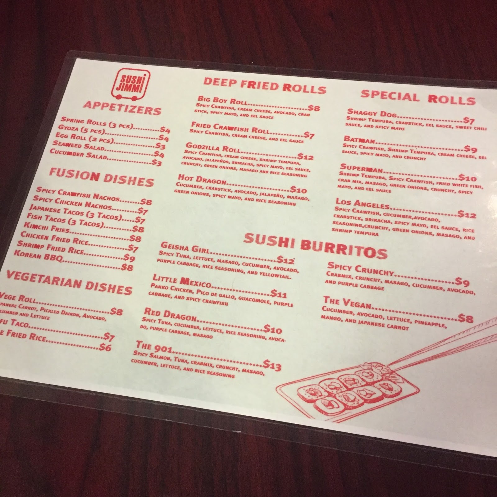 Sushi Jimmi is not a fancy or hip décor filled sushi joint – it’s in an old Wendy’s. But it’s clean, convenient and most of all -cheap!