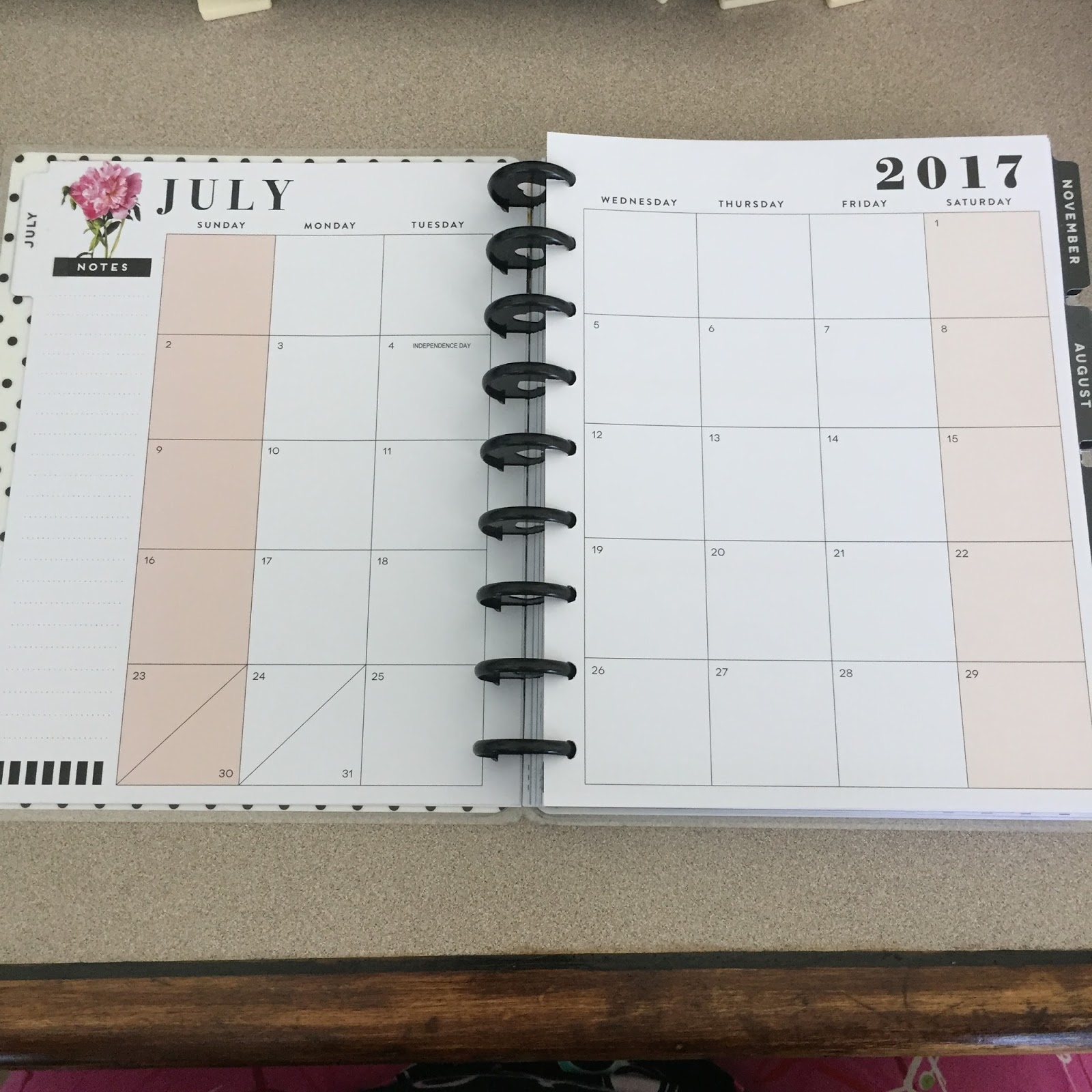 I am currently using a Happy Planner. My biggest attraction to this planner was that the disc system makes it very easy to rearrange the planner – for example I remove prior weeks to keep the planner from getting bulky and I don’t keep all 12 months in at one time. You can also add note pages or whole sections such as budgeting or fitness. The price is also very reasonable as Michael’s often has them on sale – I paid $14.99 for my Happy Planner and then another $12.99 for hard covers. The biggest weakness of this planner is that the disks are not sturdy and this planner does not lend itself to travel. With us moving into our new home this week I’ve decided I need a separate home planner for keeping up with maintenance (for example, our lawn should only be watered once a week so I need to keep up with when it rains) and meal planning. Since I will be keeping this planner at home on my desk and not transporting in my purse I do not see the discs being a problem. Also, it is harder to find stickers that fit just right for this planner so it’s best to decorate without using kits.