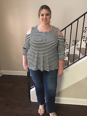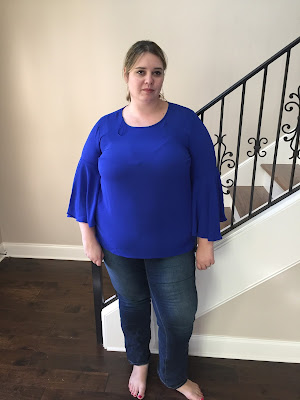 So, you can tell by the look on my face I was starting to get a little grumpy with this experience. This bell sleeve top should have been a win – a popular style and the color is perfect for me as a U of Memphis fan but the fit was super awkward under the arms. This top is $99 which I already thought was a bit steep for such a plain top but I’ve gotten better quality tops from Target so yeah, not so great.