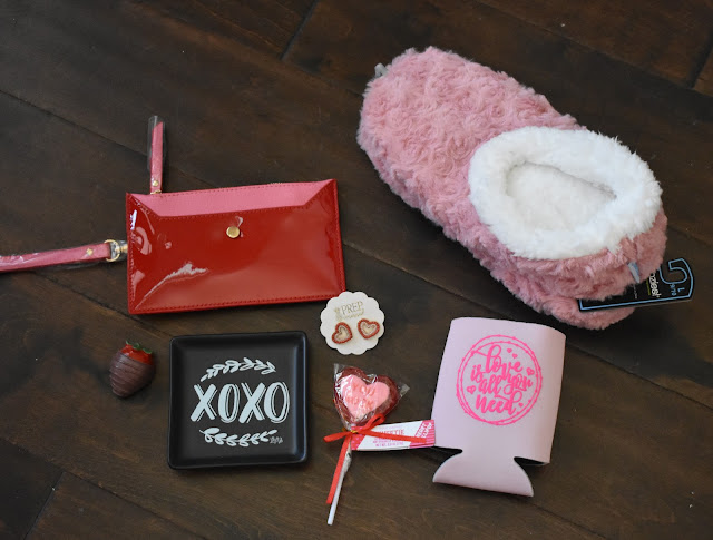 The Valentine mailer promised a pair of slippers and six valentine essentials. Prep Obsessed has been selling a ton of the snoozie brand slippers so I strongly suspected they would be included and figured there would be a few jewelry  items, a sweet treat and a koozie.