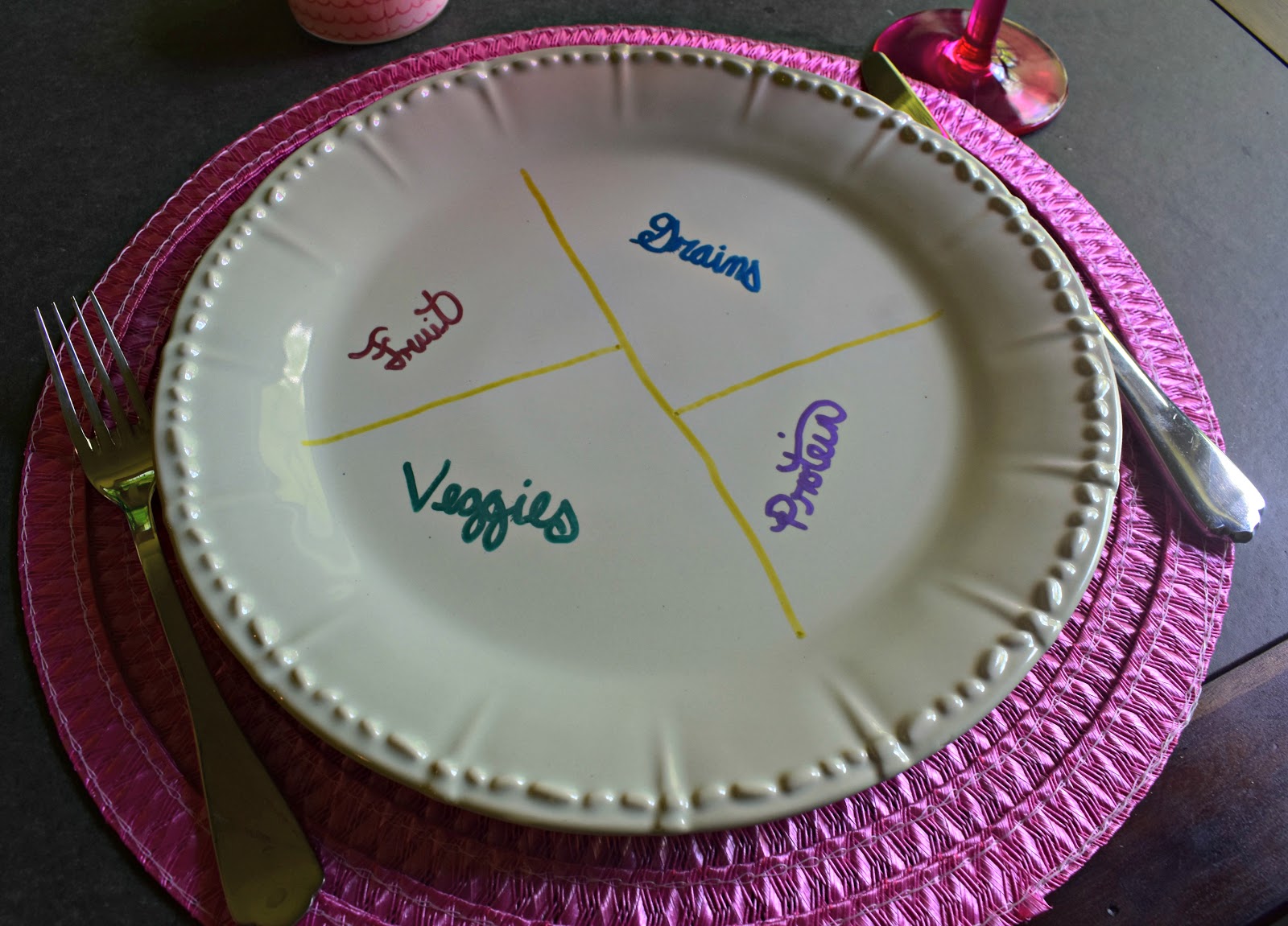Speaking of cooking, I’ve been trying to eat healthier lately and I’m still trying to get the portions right. Since Wine Glass Writer is non-toxic I’ll just draw a quick grid on my plate to remind myself to not take too much carbs (because I love some carbs) and get enough veggies. Typically I just draw the lines, but I wanted to show y’all an example of what I would put on my plate.