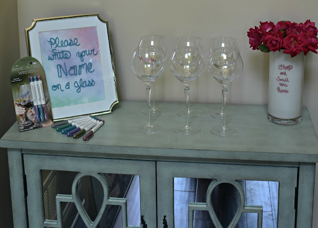 When entertaining my goal is always to have the drinks ready to go so that even if I’m finishing up details in the kitchen (which I often am truth be told) everyone can go ahead and have a drink and get the party started. Instead of just setting out the Wine Glass Writer I like to leave my guests a little note so they know how to use the Wine Glass Writer. Even when not entertaining I like to write fun sayings on a picture frame for a cute home accent – and it can be changed whenever I want without building more clutter.