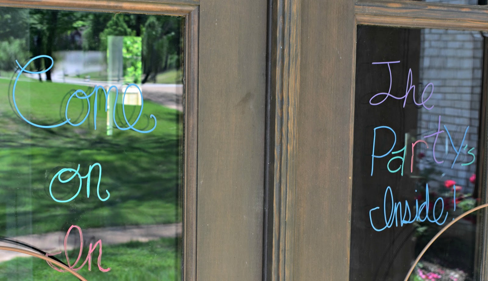 When we have friends over for an event they tend to be pretty informal affairs – the kind of come on in and make yourself at home kind of events – so I’m not always available to greet each guest at the door. Writing a note on the glass is a fun way to let people know there’s no need to ring the doorbell and wait to be let in but looks a lot nicer than a post-it note on the door – plus it won’t fall off and become litter.
