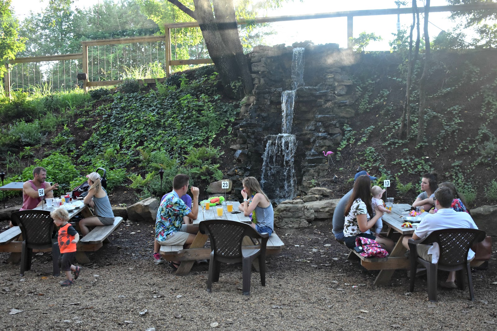 The outdoor area features two waterfalls, picnic tables, and elevated performance area where there is music on the weekends and a seating area with fire pits. I saw several people had brought their dogs so this up-ed the appeal for me.