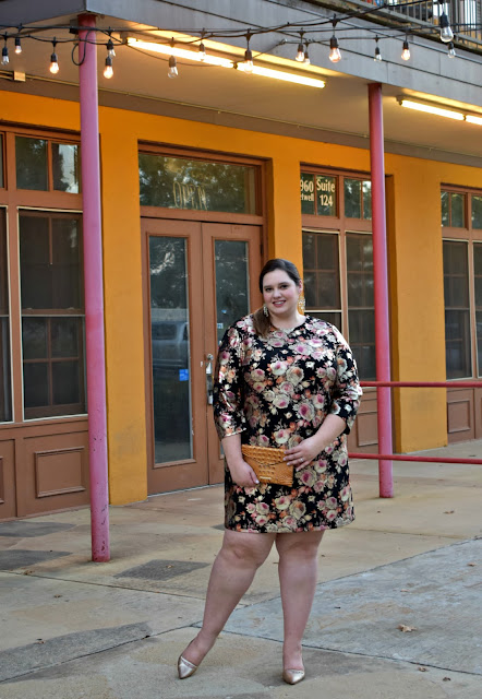 Of course, It would be foolish of me to ignore the obvious – this dress makes a great night out on the town dress. I selected simply jewelry to let the foil floral design be the star of the outfit and rounded out the look with gold heels and a neutral clutch.